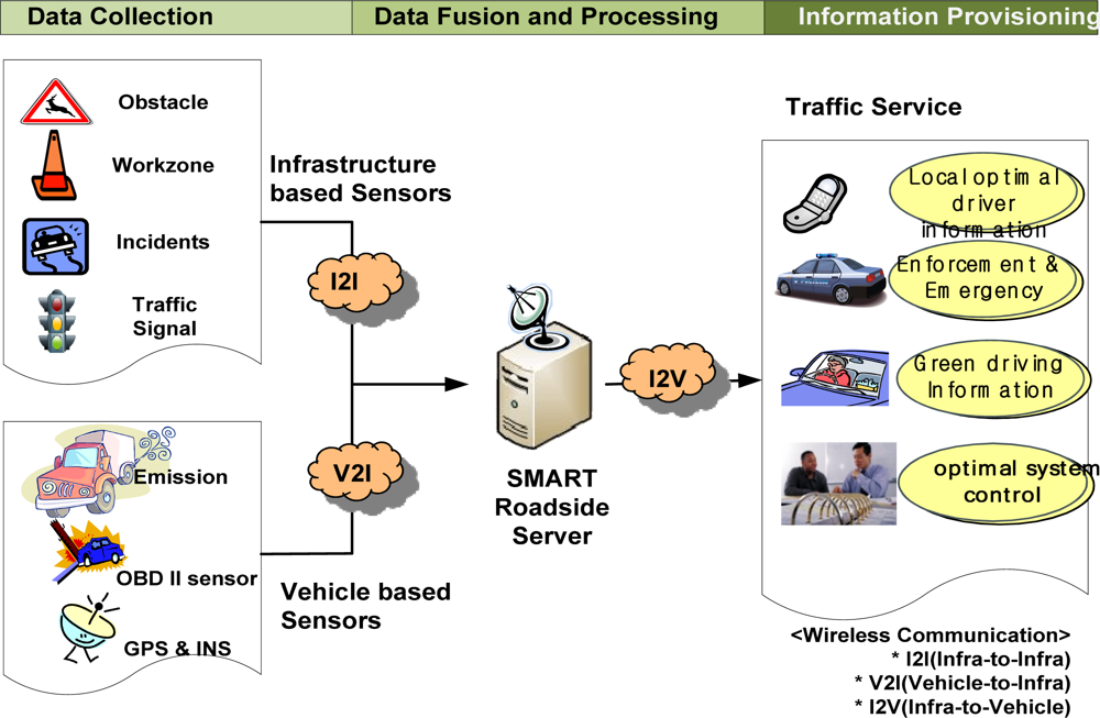 The framework of a smart road server and sensor system is shown in Figure 4. The framework consists of five parts: infrastructure-based sensors, vehicle sensors, smart roadside server, wireless communication, and traffic service providers. A series of processes for a road and vehicle system consists of data collection, data fusion and processing, and information provisioning. In data collection, not only do infrastructure-based sensors collect certain obstacle data, work zone data, incidents, and traffic signal times, but vehicle sensors also collect emission data as well as vehicle speed, location, and RPM. These data can be transmitted to a smart roadside server using infrastructure-to-infrastructure (I2I) and V2I communication networks such as DSRC and Wireless Access for Vehicular Environments (WAVE). At a roadside server, these data undergo appropriate processing such as data fusion. The optimal information is then provided to drivers through a Telematics The framework of a smart road server and sensor system should have the following capabilities and requirements: