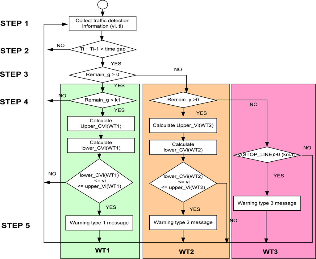 Step 4: In the WT1 case, if the remaining time for a green light is less than k1, calculate the red-light violation warning information as in Equations (1) and (2):