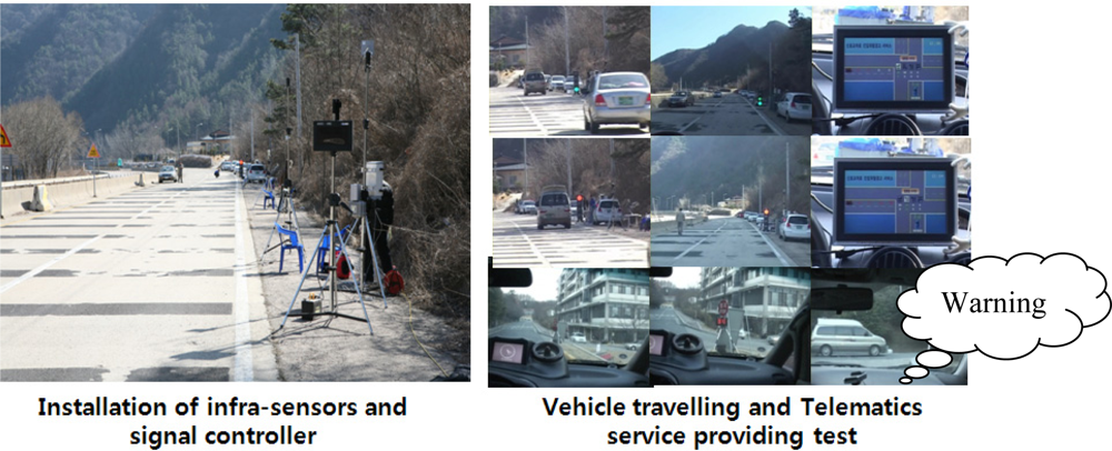 According to plans from the U.S. Department of Transportation, the so-called ITS Strategic Research Plan (2010–2014), IntelliDrive projects dealing with ICT and transportation convergence technologies, including vehicle-to-vehicle (V2V) interaction and vehicle-to-infrastructure (V2I) interaction, are concurrently underway. One of the important items of the ITS Strategic Research Plan is making an intelligent roadside system under a Smart Roadside project, which began in 2008. The vision of a Smart Roadside is a system in which commercial vehicles, motor carriers, enforcement resources, highway facilities, intermodal facilities, toll facilities, and other transportation system nodes collect data for their own purposes. The nodes can then share the data seamlessly with relevant parties in order to improve motor carrier safety, security, operational efficiency, and freight mobility. In Europe, Cooperative Vehicle-Infrastructure Systems (CVIS) projects have been underway since 2006, and are supported by a grant from the European Commission. A precondition of the CVIS projects is that users of cooperative systems be made aware of these systems and understand how they can help drivers operate more safely, economically, and comfortably. Operators should also run their roadway networks in more cost- and eco-effective ways. Here, “cooperative” indicates systems that cooperate on two levels: (1) direct communication and the exchange of valuable information between entities; and (2) dynamic interaction amongst roadway users and transport infrastructure, which can provide win-win benefits for both drivers and roadway operators. The main elements of a high-level CVIS system are the vehicle, roadside system, and central system. In particular, a road side system includes standardized access, secure communication between vehicles and infrastructure, authentication, authorization, updates, and software configuration. Driven by the Korean government, the SMART highway R&D project was recently launched in 2008, and is expected to be completed by 2015. A SMART highway is a future high-speed roadway that supports an intelligent and convenient driving environment by providing roadway, vehicle, environmental, and human information, enabling users to concentrate solely on their driving and helping reduce accident rates. The SMART highway system uses a local server as a smart roadside server. This local server has some important functions. Through the IntelliDrive, CVIS, and SMART highway projects, researches regarding infrastructure-based sensors and OBD II-based vehicle sensors for safe driving have been ongoing. These infrastructure, in-vehicle, and smart roadside server sensors can enhance driver capability and perception.