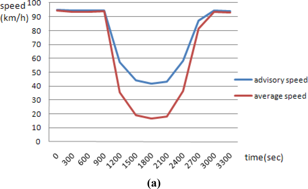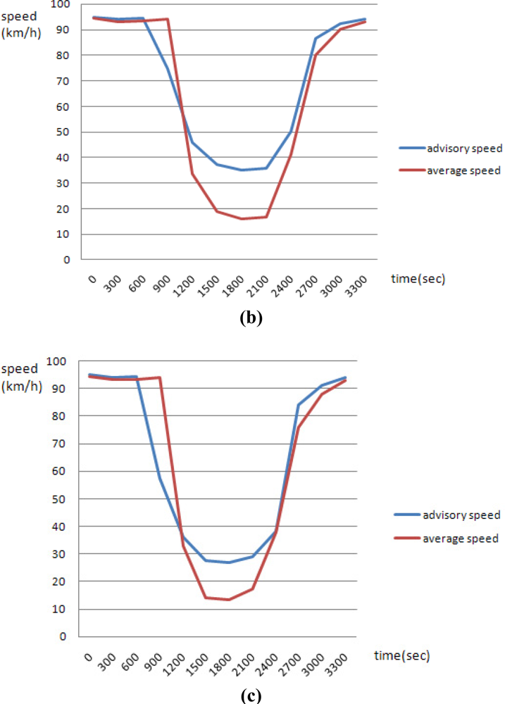 When the road surface is dry, wet, or icy, the average advisory safety speeds are 80 km/h, 76 km/h, and 68 km/h, respectively. Under an accident situation, the average advisory safety speed is 40 km/h, which is 40 km/h less than when no accidents have occurred. Figure 9(a–c) shows some of the simulation results for 12 scenarios under good traffic conditions and accident states, but where the state of the road surface state varies.