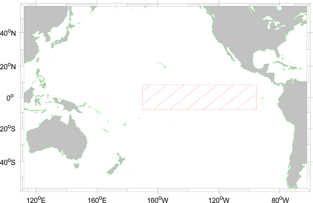 To evaluate the accuracy of data products derived from satellite infrared sensors, in situ measurement is necessary. The buoy data from the Tropical Atmosphere Ocean (TAO) Project in the tropical Pacific Ocean ( http://www.pmel.noaa.gov/tao/data_deliv) have been used for comparison and validation the satellite data. For example, Murray et al. [12] used TAO SST and wind data to validate the ATSR (Along Track Scanning Radiometer) satellite data. Neeaj et al. [30] used the TAO data to validate the quality of QuikSCAT and NCEP (National Centers for Environmental Prediction) data. Wu [31] and Legeckis and Zhu [32] applied TAO 1 m depth of the accuracy of SST can be 0.01 K. Chambers et al. [33] measured heat content of the Pacific equatorial region, using TOPEX altimeter and TAO data. Therefore, in this study we also used TAO data as the ground truth to compare and validate our results. The study area is from 8°N to 8°S in latitude and from 95°W to 170°W in longitude, as shown in Figure 1. The time span of the data is from May 2003 to December 2007. The TAO data at some stations have high sampling rate of 10 min. We have averaged the 10-min data into hourly and daily datasets including wind speed and relative humidity. We also compute the standard deviation of the data products when we perform the average.