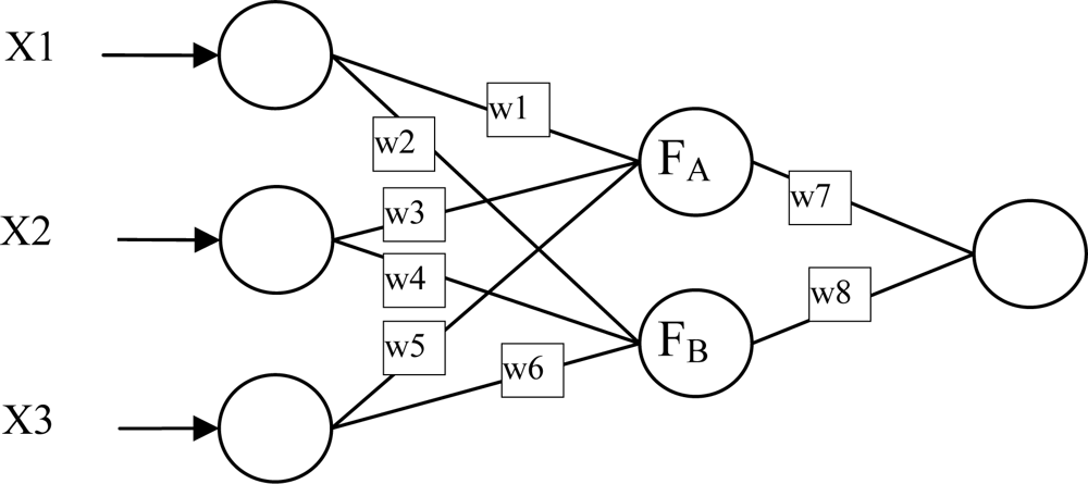 BPN plays a very important role in the artificial neural network. The reason to improve BPN is to enhance the training speed, avoid falling into local minima, and promote the capability. The traditional BPN adopts the steepest descent method to train and update weight values, and has the following shortcomings: (1) it is apt to converge to local minima; (2) slowly updated weight values and (3) long learning times, possibly causing divergent results. In this study, we combined the advantages of the Steepest Descent Method and the Newton Method in the Levenberg-Marquardt (L-M) as the BPN learning law [38–41]. Three-layer Back Propagation Algorithm (BPA), including input, hidden, and output layer, is employed in this study (Figure 2). There are six hidden neurons. Epochs are 1,000, goal is 0.1, and max fail is 6. The output variable is the TAO SST (Xsst). In the back-propagation neural network, complete connection is established between each input variable and each neuron in the hidden layer, while each connection is given a weight (Figure 2). Through the interconnection between the three weight values, w1 (w2), w3 (w4), w5 (w6) and three input variables, the relative contribution of each input variable to the hidden neuron FA (FB) would be determined. The weight of each hidden neuron can be used to determine the most influential variable in the model and can be calculated using Equation (4) as: