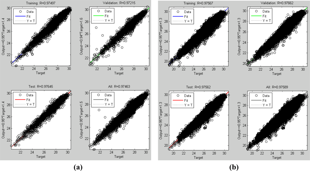 A random selection is the most suitable way for an ANN analysis as the training and validation process requires “familiarizing” the network with all possible conditions of inputs and the corresponding target outputs [37–39]. Within the large coverage areas of GOES sensor, more data would be acquired from positions away from the nadir than from those near the nadir. To minimize variables’ weighted difference in model calculation resulted from uneven distribution of data, stratified sampling method on the basis of 0.5 K, a PO.DAAC data bias, are used in the analysis of consolidated hourly mean data (Table 3). The number of randomly sampled SST data does not exceed 1,000 with a bias of 0.5 K in each station during the same month in each year. The number of randomly sampled SST data with a bias greater than 0.5 K or smaller than 0.5 K in each station during the same month in each year does not exceed 1,000, either.