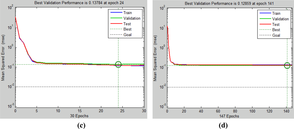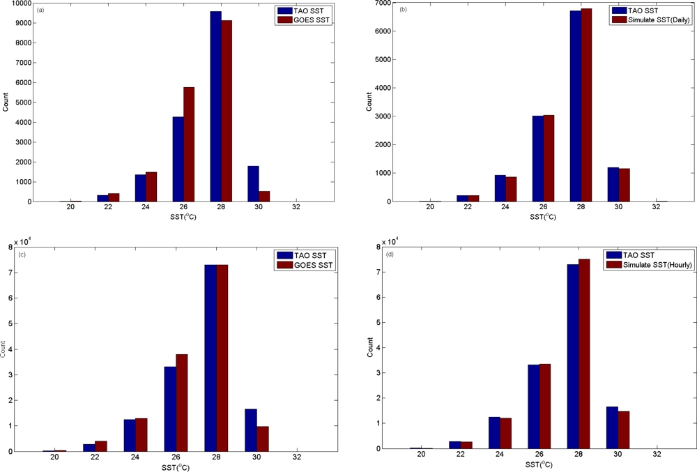 Figure 4 shows the daily data and hourly data of GOES SST and the simulated SST versus TAO SST. Comparing with TAO SST data, the original GOES SST data exhibited a tendency to overestimate at lower temperatures (<28 °C), and an underestimating tendency at higher temperatures (≥28 °C) (Figure 4(a,c)). However after applying the model, the accuracy of simulated data is significantly improved (Figure 4(b,d)). As shown in the BPN weight table (Tables 4 and 5), exhibited higher weight values in both daily and hourly data. A comparison with heavy-weighted variables removed is listed in Table 6 which shows an increase of RMS by more than 0.6 K for both daily and hourly data. When the top three variables of the sum of absolute weight values are removed, the RMS is increased by more than 1 K for daily data and 0.7 K for hourly data. Both and are the most influential factors in daily and hourly models.