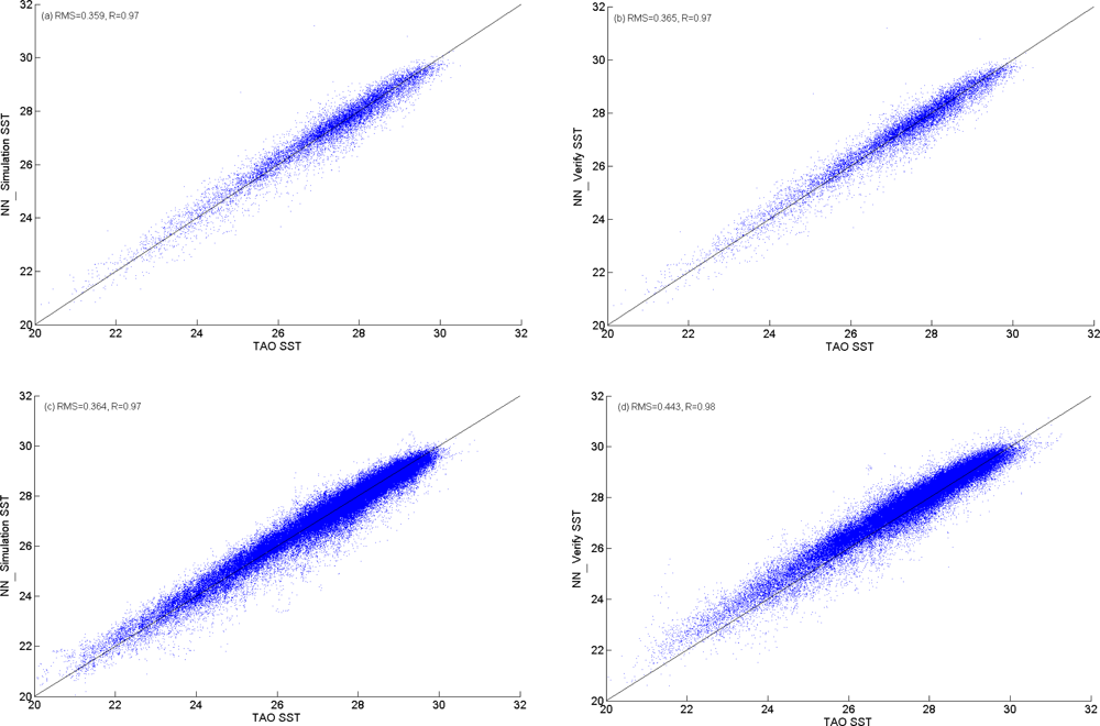Sources of errors from satellite-derived SST include aerosol and water vapor in the atmosphere, clouds, instrument errors and the sampling errors from skin effect [13], among which, instrument errors may cause measurement inaccuracy up to 0.1–0.2 K [44]. Many studies with GOES SST employed nocturnal data only, or focused on specific sea areas and time periods [12], with an aim for acquiring potentially better data. This study employs a large amount and continuous in-situ TAO and GOES SST data for analysis, and the data quality of GOES SST is significantly improved. The model established with BPN algorithm reduces RMS from original 0.58 K to 0.38 K for daily data, and from 0.66 K to 0.44 K for hourly data. Repeated the verification of model in Figure 5, the RMS is 0.37 K and the correlation coefficient R is 0.97 for daily data and are 0.44 K and 0.98 for hourly data, respectively. Such results are not only better than the original data error of 0.5 K but also 1 K by Wu et al. [36] and 0.7 K by Liu et al. [45].