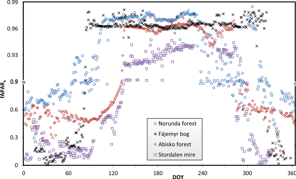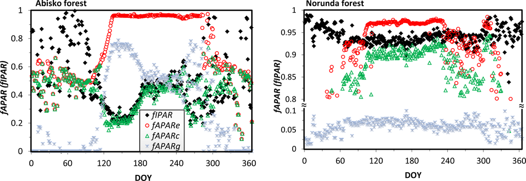 Periods with different fraction quantities indicate different phenological stages of the forest canopy and ground vegetation, and differences in PAR absorption reflect different productivities. Variations in fAPARe indicate the seasonality status of the whole ecosystem, and the signal is composed of both variations in vegetation cover (high fAPARe) and snow cover (low fAPARe). In the growing season, increases in the absorbed PAR may imply increasing productivity, e.g., for the canopy. However, for the ground vegetation, the decrease in fAPARg does not necessarily mean that the ground vegetation productivity is decreasing. For example, during the period of DOY 160–183 in the Abisko forest, the decrease is caused by an increase in canopy-intercepted PAR.