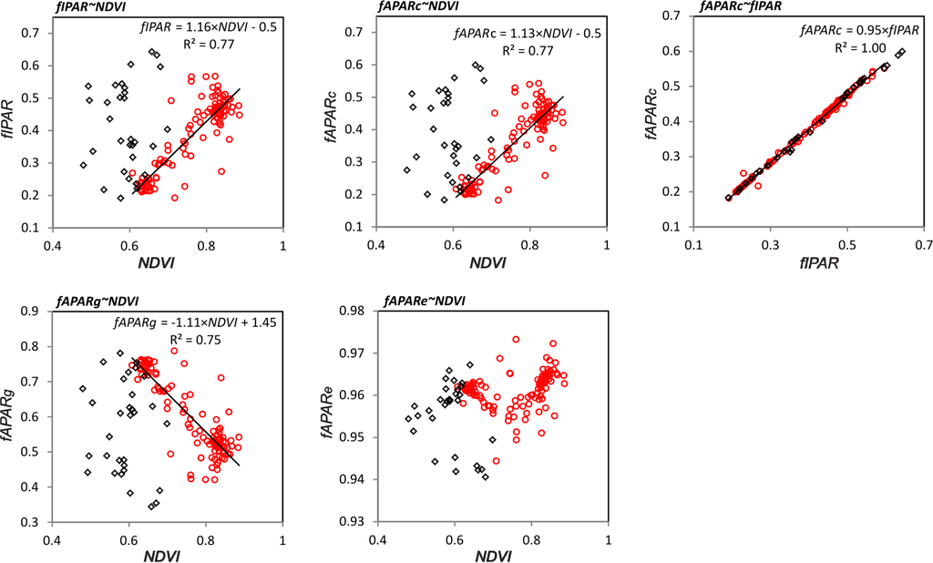 There was a linear relationship (R2 = 0.77, N = 133) between the fraction of canopy-absorbed PAR, fAPARc and NDVI, for the Abisko forest from the start of the growing season until before the leaf discoloration period (DOY 135–249) (Figure 11). The linear relationship deteriorated during the leaf discoloration and defoliation period (DOY 250–280), when NDVI values were generally decreasing. Similar results are also obtained for the relationship between the canopy-intercepted PAR, fIPAR, and NDVI. fAPARc was consistently 5% lower than fIPAR throughout the snow free period (fAPARc = 0.95· fIPAR; R2 = 1.00, N = 133). The fraction of ground absorbed PAR, fAPARg, showed a negative relationship with NDVI, which reflects that the ground vegetation absorbed less and less PAR during the course of the NDVI increase, since an increasing amount of PAR was absorbed by the forest canopy before reaching the ground. This PAR competition lasted until the tree leaf discoloration and defoliation, evidenced by the NDVI increase during DOY 259–282 (Figure 6, Abisko forest). This short term recovery is attributed to the ground vegetation. There was no linear relationship between the total PAR absorbed by the ecosystem, fAPARe, and NDVI. The variability of fAPARe during the snow free period (standard deviation, std = 0.004) is much smaller than the variability of other PAR fractions (std = 0.10 − 0.11).