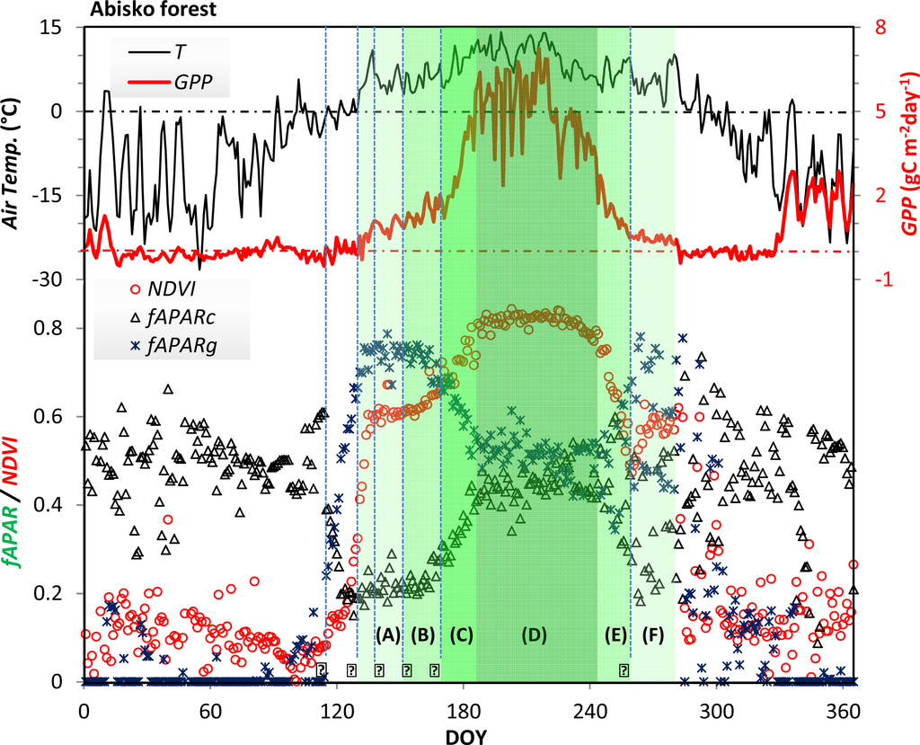 The site is complex in the sense that it consists of sparse deciduous canopy on top of a partly evergreen understorey layer. As explained in the previous sections, the seasonality of snow, understorey, and overstorey are confounded, creating a complex annual reflectance curve. GPP starts to increase above zero at almost the same date in spring as the temperature does, and it decreases to zero in the autumn, slightly before the temperature. The timings of phenophase transitions from ground observations and phenology camera images are drawn as vertical lines (labeled 1–6 in Figure 12). These dates match the optical observations of PAR and NDVI well. The period of snow melting (1–2) is characterized by a very rapid increase in both fAPARg and NDVI. During this period GPP increases quite slowly. The period after the main snow melt, when the buds of the birch trees are developing (3–4), is identical with the NDVI “shoulder” period. During this period GPP increases slowly, probably due to a low rate of understorey photosynthesis. fAPARg has reached its maximum, and fAPARc is relatively constant. In mid-June (5) the birch leaves are fully developed, and both GPP, NDVI and fAPARc increase rapidly. They reach a maximum at DOY 183 (NDVI four days earlier than GPP), and level out during the middle of the peak season. In the autumn, GPP starts decreasing ca. 18 days earlier than NDVI and fAPARc. Leveling out of GPP matches the date of yellowing of leaves (6), and NDVI reaches its minimum value. After this date, NDVI increases again, concurrently with fAPARg, and probably as a consequence of exposure of the green understorey due to shedding of the birch leaves. GPP remains low but positive throughout this period, indicating some understorey vegetation productivity. When the temperature falls below zero degrees NDVI drops rapidly to below 0.2. During the winter season the optical data sets are very noisy. During the growing season, however, it can be noted that the NDVI curve is less noisy than any of the other curves, including GPP. The green fields in Figure 12 denote the vegetation period according to the optical measurements: (A) the period dominated by understorey growth; (B) the period from bud-burst to full leaf development; (C) the period of leaves developing into a full canopy; (D) the period of mature canopy; (E) the period of discoloration and start of defoliation of the canopy; and (F) the period of re-exposure of ground vegetation due to defoliation.
