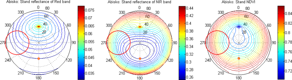 In order to investigate the feasibility of sampling anisotropic reflectance using a wide-angle sensor we used the Kuusk and Nilson forest reflectance and transmittance (FRT) model [39] to simulate reflectance measured by our tower sensors under hemispherical-conical geometry. The model was driven with field measurements on average stand characteristics (Table 5), and ground vegetation properties. In the model, PROSPECT [40] is used for leaf optics, and 6S [41] is used for atmosphere correction, simulating both direct and diffuse sun light. The sun was fixed at a zenith angle of 40°, and simulations were made over all azimuth angles, and zenith angles varying between 0 and 80°. Figure 4 displays simulated HDRF for red and NIR bands, and for NDVI. The HDRF properties of the ground vegetation can also be given by the FRT model. The modeling results were further integrated over the footprint area to simulate HCRF, reflectance and NDVI, as measured by our tower sensors under hemispherical-conical geometry. These computations were made for one forest canopy simulation and one ground vegetation simulation separately.