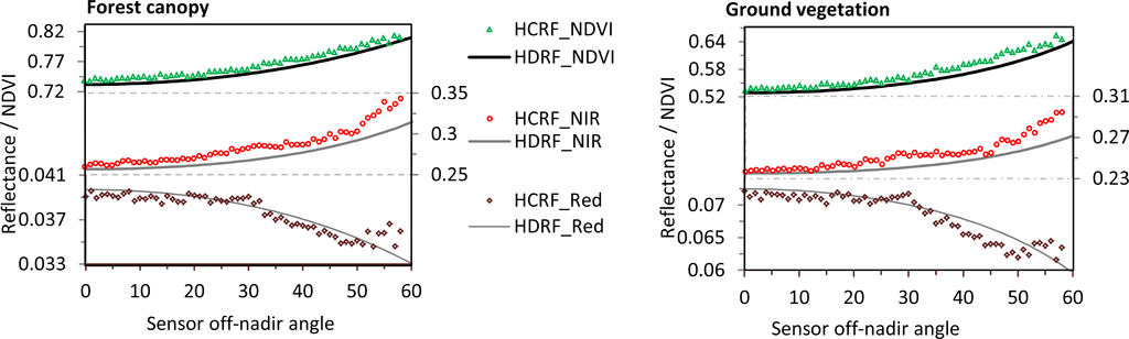 Figure 5 shows that the HCRF and HDRF curves are very close to each other, indicating that almost identical results can be achieved using large FOV observations as when observing with infinitesimal FOV. This is equally true for forest canopy and ground vegetation. Due to the BRDF effects, off-nadir observations in NIR and NDVI are larger than those of nadir viewing, whereas the red band displays opposite variations. We note that there is bias in HCRF results in Figure 5 for sensor oblique angles greater than 50°. This is due to the facts that we used a 60° FOV sensor and that the FRT model does not give accurate results for viewing angles as high as 80° and above [43] (80° being the far edge of our measurements considering the off-nadir angle and the FOV; 50° + 60°/2 in our observation geometry). Because of the fact that points with over 80° viewing angle are rare in our sampling, these points contribute minimally to the integration result, and they were neglected.
