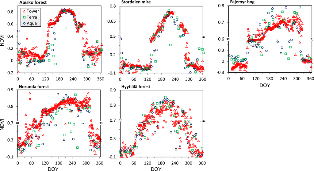 We observed large increases in NDVI during the spring period of the five sites (Abisko forest DOY 103–135, Stordalen mire DOY 128–136, Fäjemyr bog DOY 80–95, Norunda forest DOY 100–106, and Hyytiälä DOY 58–83). By combining information from phenology camera images and weather station records we know that these are the snow melting periods.