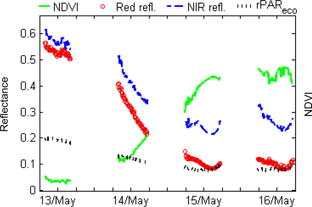 A likely source of noise in our optical sampling network is the effect of raindrops, snow, and dust on the upward-looking sensors, which might lead to a negative bias in the irradiance measurement. Though we could not confirm it, this would overestimate reflectance, and since this influence would be greater for the NIR band than for the red band, would introduce some positive bias in the tower NDVI measurements. During the winter our ground sensors were indeed covered by snow during some periods.