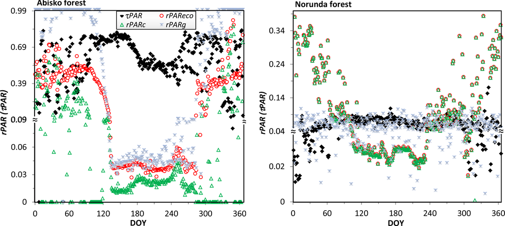 In the Abisko forest, the snow season can be easily identified from the ground PAR reflectance, rPARg, which approximates to one for the snow period (before DOY 87 and after DOY 293), and falls below 0.05 during the snow-free period (DOY 135–280). As a contrast, the pure canopy reflectance, rPARc, should always hover around a low value, since both green leaves in summer and bare branches in winter have low reflectance. However, we observed relative higher rPARc for some intermittent periods in winter. These high reflectances were most likely caused by short periods of snow on the branches.