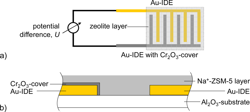 Some recent applications of zeolite films and membranes are reviewed in [8]. Compared with semiconducting oxides, zeolites have rarely been investigated for gas sensing purposes. Recent reviews [9–11] point out that zeolites are either used as filters (more generally described as “auxiliary elements” [12]) or as functional elements for sensor principles relying directly on the conductive, adsorptive, or catalytic properties of the zeolite, triggered by the zeolite’s interaction with the surrounding atmosphere. In some pronounced applications, a selective adsorption of an analyte changes the electrical impedance of the zeolite. This principle can be utilized, for instance, for hydrocarbon gas sensing [13–15], for ammonia gas sensing [16], or for water vapor detection [17,18]. Usually, the sensors are manufactured in a planar technology with the zeolites being screen-printed onto interdigitated electrodes (abbreviated as IDE in what follows) that have been previously applied on insulating alumina substrates. The typical operation temperature is between 200 and 500 °C. The advantage of the planar setup is a fast diffusion of the analyte through the zeolite with the result of a fast sensor response. In the case of the ammonia sensor, it is obvious that the bulk properties change with ammonia adsorption [19], whereas in some hydrocarbon sensors, electrode/bulk interactions seem to play a major role [20]. The detailed effect remains a subject of discussion [21,22].