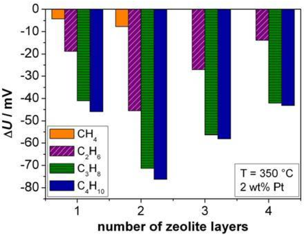 At first glance, it seems strange that the sensor signal increases with an increasing zeolite layer thickness (from one to two layers). However, this agrees with findings in reference [33], also for conductometric sensors. There, the response to 500 ppm saturated hydrocarbons as well as to 1,000 ppm H2 increases with a catalytically activated Pt loaded ZSM-5 filter layer. This is exactly what is observed here. One may speculate that during the diffusion through the zeolite a partial oxidation reaction occurs, leading to very reactive intermediate species. In the case of methane, a thickness of three layers might be sufficient to oxidize all molecules that diffuse through the zeolite layer to the electrode.