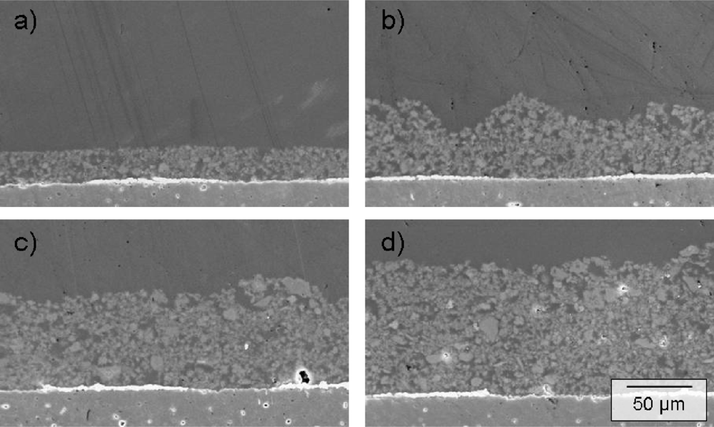 The reduced zeolite powders were processed to screen-printable pastes by mixing them with organic binders (KD 2721, Zschimmer & Schwarz) and homogenizing the mixture in a roller mill. The zeolite pastes were screen-printed on the Au/AuCr interdigital electrodes. To increase the thickness of the zeolite cover (one layer equals ∼25 μm), the transducers were dried for 5 min at 110 °C. Then, another layer of the zeolite paste was printed. The pastes were annealed for 6 h at 450 °C (heating rate: 0.8 °C/min). During the heat treatment, the organic compounds were removed and the Cr covers on the interdigital gold electrodes were oxidized to Cr(III) oxide. A picture of a final sensor is shown in Figure 2(c). The SEM micrographs (Figure 3) show cross sections from zeolite layers of different thicknesses. The thickness increases almost linearly with the number of screen-printed layers. The Cr(III) oxide layer on the opposite fingers of the interdigital electrode is not observable with this analysis method.