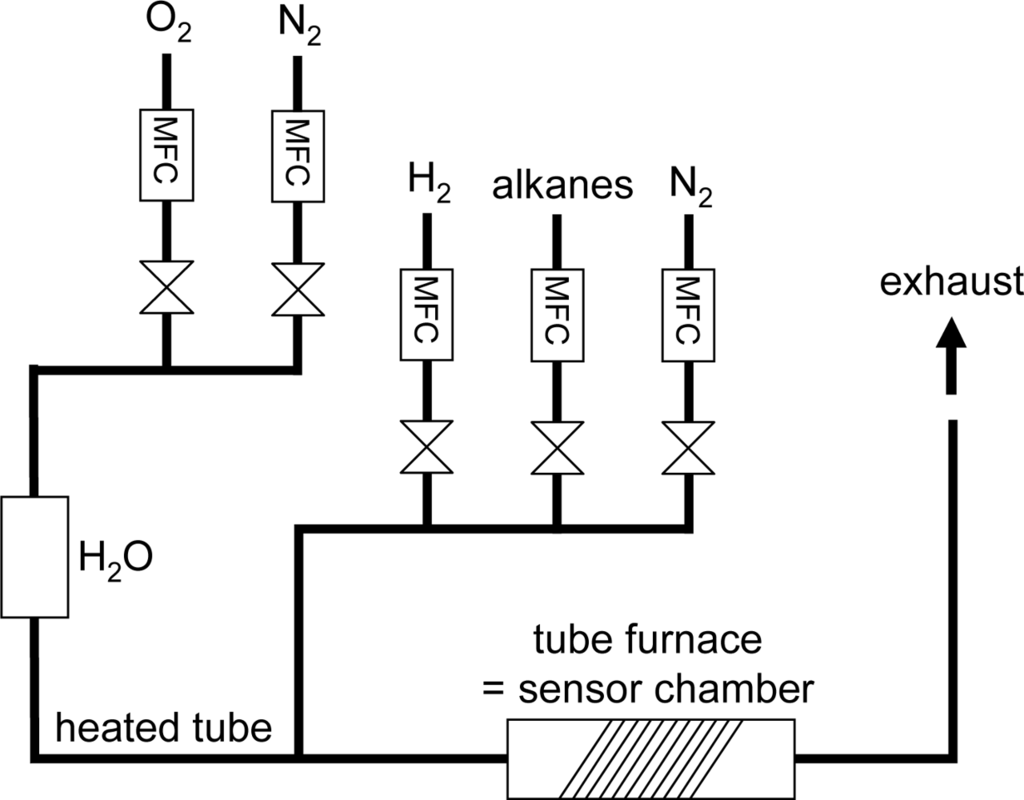 For the sensor measurements, the base gas atmosphere was composed of 10% O2 and 2.5% H2O in an N2 flow. 500 and/or 1,000 ppm of the test gases H2, CH4, C2H6, C3H8, or n-C4H10 were added. The total gas flow was 600 mL/min. The sensor output is the potential difference, U, between both electrodes. Some authors denote this also as an electromotive force (emf). The potential difference U was measured with a digital multimeter (Keithley 2700, input resistance > 10 GΩ) in a tube furnace (the setup is described in Figure 4), in which the gas sensors were heated to 300, 350, or 400 °C. Further details of the test setup are given in [31]. The gas exchange time of this test bench is about 75 s. To compare the results of different experiments, the sensor response ΔU, which is defined as the difference of U in the base gas atmosphere and U in test gas atmosphere is plotted.