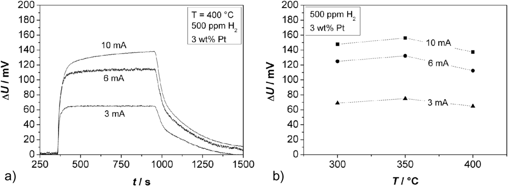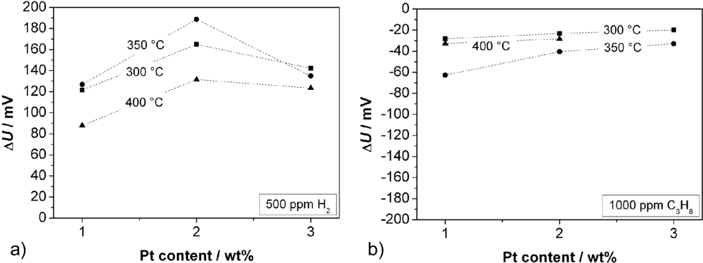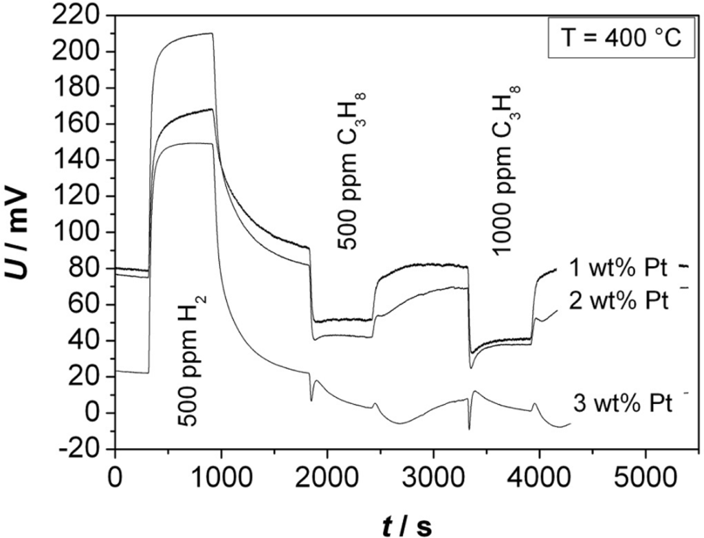 The measurement shown exemplarily in Figure 5 was conducted at 400 °C. It shows the response of a sensor toward H2 (500 ppm) and C3H8 (500 and 1,000 ppm). An obvious effect is that the potential difference U increases with H2, which is in contrast to C3H8 exposition that yields an opposite effect.