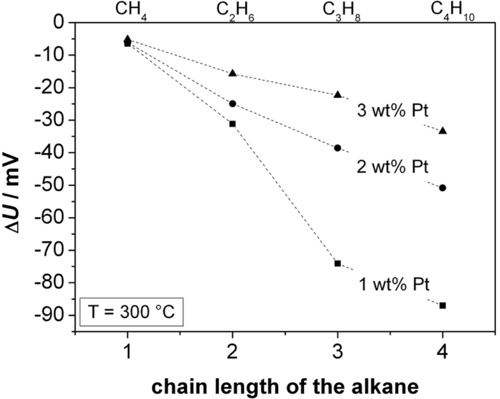 CH4, C2H6, C3H8, and n-C4H10, each of them in a concentration of 500 ppm, were added to the base gas separately. The sensor response at 300 °C is plotted in Figure 7 in dependence of the chain length of the alkanes for different Pt contents of the zeolite. One can observe that both a lower Pt loading and a higher C-atom number leads to a higher sensor response.