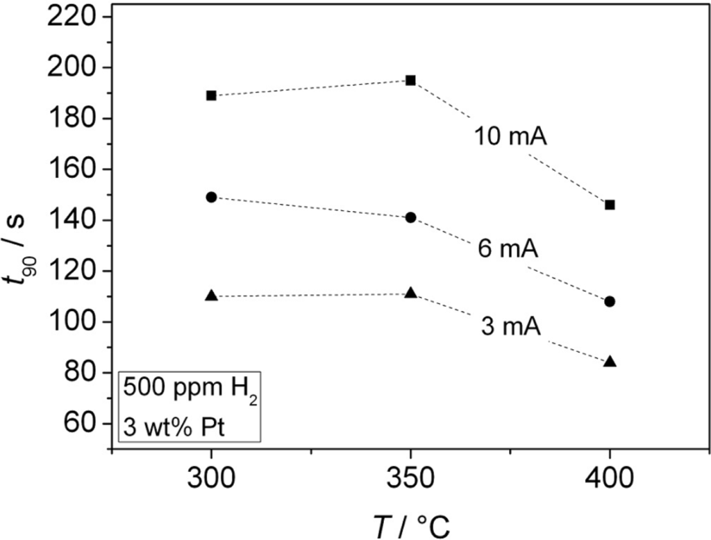 From these curves, the sensor response time and the sensor output change ΔU [Figure 8(b)] was determined. The sensor responds faster for thinner chromium oxide layers (t90 = 84 s for the thinnest oxide layer at 400 °C, which is close to the gas exchange time of the test bench). The response time t90 of the sensors with different thicknesses of the Cr2O3 film is shown in dependence of the temperature in Figure 9.