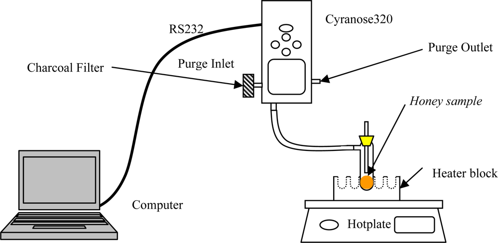 The e-nose setup for this experiment is illustrated in Figure 1 and the settings for the sniffing cycle are also indicated in Table 2. Each sample was drawn from the bottle using a 10 mL syringe and kept in a 13 × 100 mm test tube and sealed with a silicone stopper. Each sample was replicated five times. Before measurement, each sample was placed in a heater block and heated up for 10 min to generate sufficient headspace volatiles. The temperature of the sample was controlled at 60 °C during the headspace collection. Preliminary experiments were performed to determine the optimal experimental setup for the purging, baseline purge and sample draw durations. Ten seconds baseline purge with 30 s sample draw produced an optimal result (result not shown). Baseline purge was set longer to ensure residual gases were properly removed since all the samples were in a liquid form and contained moisture. The pump setting was set to the medium speed during sample draw. The filter used was made up of activated carbon granules and has large surface area which was effective in removing a wide range of volatile organic compounds and moisture in the ambient air. The experiment was carried out using e-nose on a variety of honey samples followed by syrup and adulterated samples.