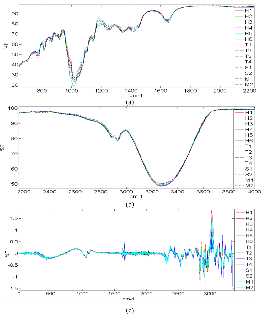 FTIR spectroscopy measurements of honeys of different floral origin, syrup and adulterated samples are shown in Figure 3. These 18 different samples show high similarity and have similar spectral features. There are however some distinctive features between different floral origin, sugar syrup and adulterated honey, as shown in Figure 3(c). The spectral region from 750 to 1,500 cm−1 corresponds to the attenuation or absorption region of carbohydrate chains such as monosaccharides and disaccharides of honey and sugar. While the negative peak observed in between 750 and 900 cm−1 region shows the presence of saccharide chain and the sharp declination curved around 1,100 cm−1 corresponds to the C-O bond in the C-OH group [13]. Both honey and sugar samples exhibit similar characteristic in the IR spectral response due to the presence of major components in both samples. Thus, differentiation of adulterated honey with lower sugar syrup concentration is not possible and these samples are hardly screened using the FTIR method.