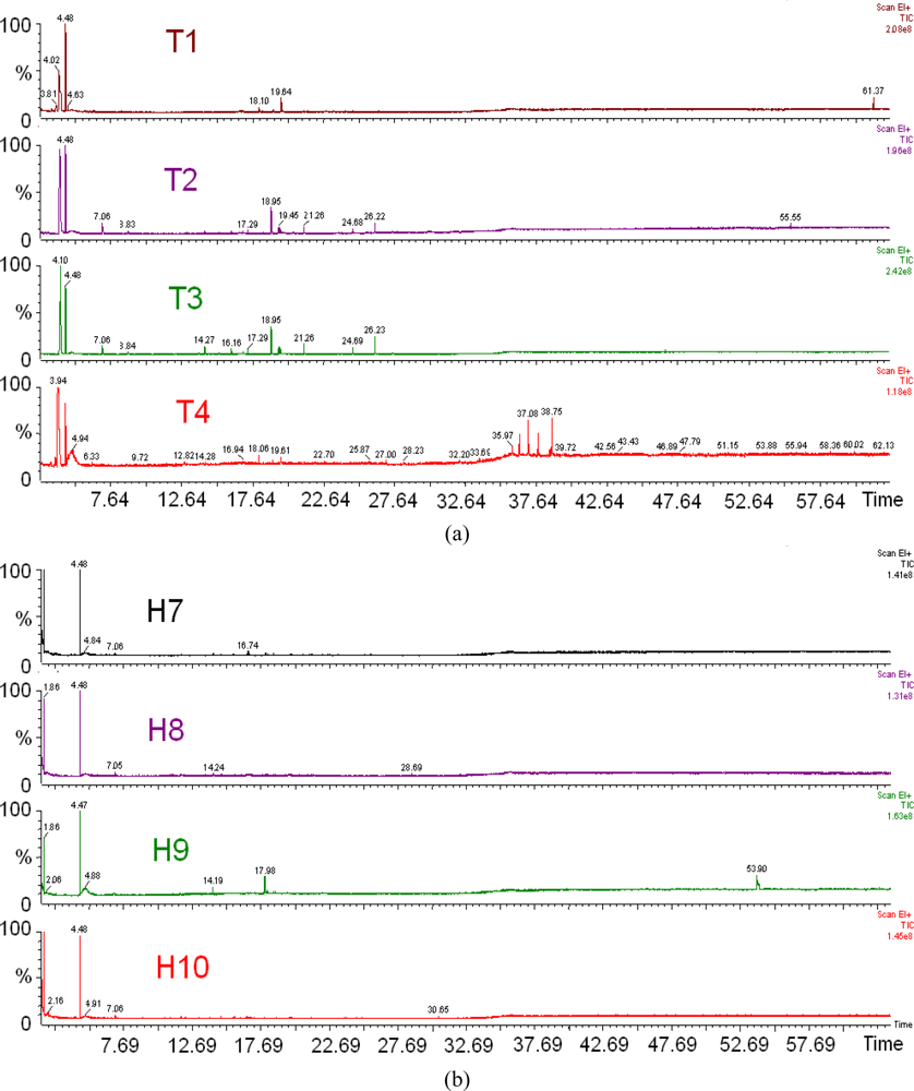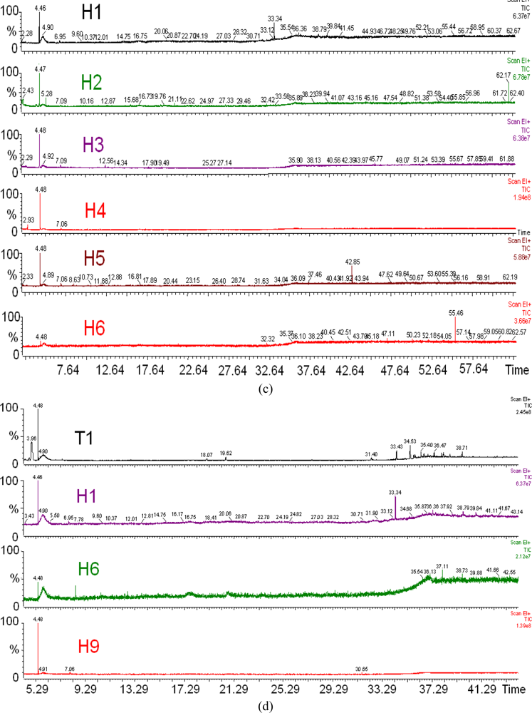 Five mL of each sample was added directly into a 22 mL headspace vial and sealed with a PTFE septum. Each vial was placed inside Turbo Matrix HS 16 (HS) and run under headspace mode. The headspace program was set using the TurboMatrix touch screen control system. The carrier gas was set to 20 psi. The HS oven was set to 60 °C and the each vial was preheated for 10 min. The needle and transfer line temperature were set to 65 °C and 70 °C respectively. A de-activated fused silica transfer line connected the HS to the Clarus 680 GC, which was equipped with a programmable split/splitless (PSS) injector, Elite-5MS-30M column (N9316282) and programmable pneumatic control (PPC). The Clarus 600 MS was controlled via TurboMass™ 5.4.2 GC/MS software and operated in electron ionization (EI) mode. The initial oven temperature was programmed to start at 40 °C and held for 5 min. It was then ramped to 150 °C at a rate of 5 °C/min and held for 2 min. The second ramp was started at the rate of 20 °C/min to 280 °C and kept for 30 min. The GC setting strictly followed a standard technique [21,22]. Helium was used as carrier gas and set to 1 mL/min. The MS scan time was set to run for 65 min and the mass scanning range set from m/z 20 to 550.0. The scan time was set to 0.2 s with a 0.1 s interscan delay. The headspace compound identification was done by looking at the retention time and comparing with the known library standards and search hits.