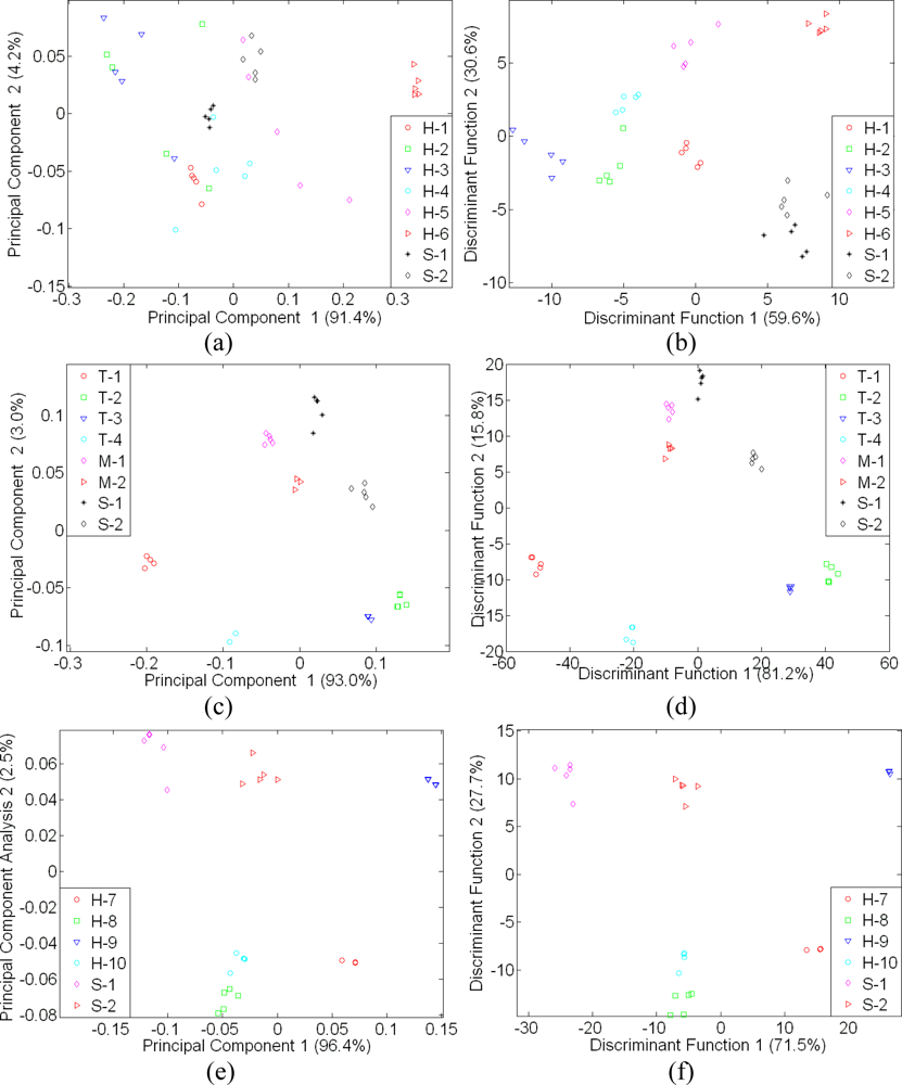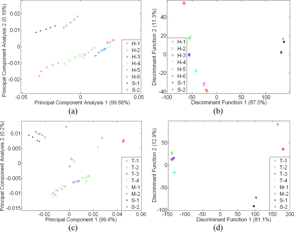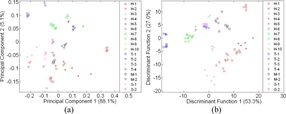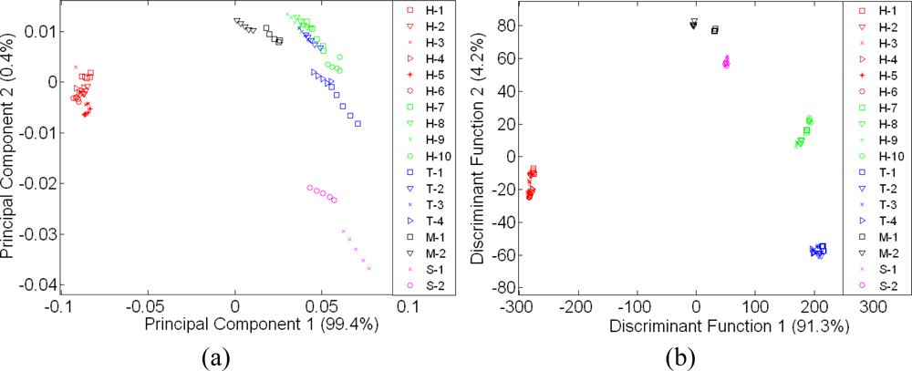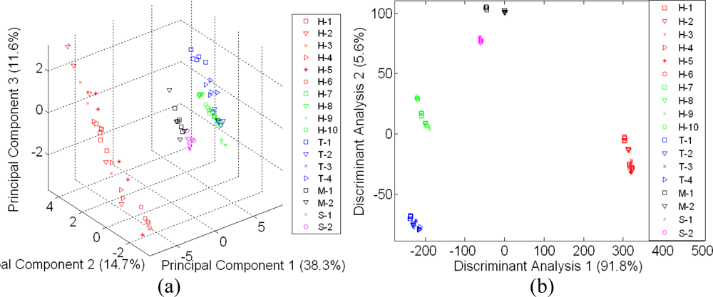 Each individual modality was projected separately by PCA based on the correlation matrix. An adequate number of dimensions projected by PCA were determined based on principal components (PCs) that have achieved cumulative variance of 80% or more. Further analyses to evaluate and classify those 18 different classes were performed using LDA. Cross-validation using the leave-one-out method was applied and variable selection was accomplished using Wilks’ lambda test to select the most significant variables that contribute toward the classification. Fisher linear discriminant function was also applied in this analysis. Both PCA and LDA were governed by the linear parametric multivariate analysis (MVA).