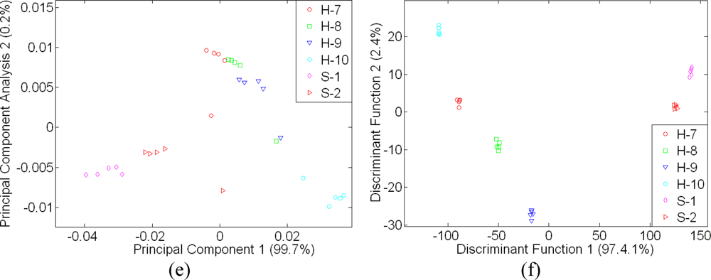 Unlike the e-nose results, both PCA and LDA results of e-tongue analysis were less effective. This is due to the fact that honey and sugar are made up mostly of carbohydrate chains. Like e-nose analysis, discrimination and classification using LDA was better compared to PCA. The comparison between PCA and LDA performance is shown in Figure 6. Figure 6(b,d,f) shows better clustering behaviour and separation between the honey samples, sugar and adulterated samples. The separation between each class was very distinctive compared to the PCA displayed in Figure 6(a,c,e). In addition, the PCA was not only incapable of discriminating honey samples of different floral origin but also unable to discriminate honey from syrup samples. This can be clearly observed in Figure 6(a).