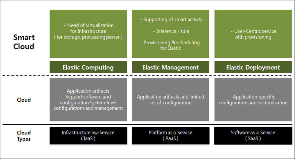 Smart cloud computing enables cloud servers to provide smart learning services to users through additional intelligent processes on existing cloud systems. The categorization of the demands for smart cloud computing is shown in the Figure 1. The most important responsibility of the servers is to perform elastic processes such as Elastic Computing for Infrastructure as a Service (IaaS), Elastic Management for Platform as a Service (PaaS) and Elastic Deployment for Software as a Service (SaaS) constantly. The elastic processing can be described as collecting user information that is pulled by the sensors in the users’ mobile devices and process the pulled information in real-time so that it can accommodate users’ changing situation dynamically.