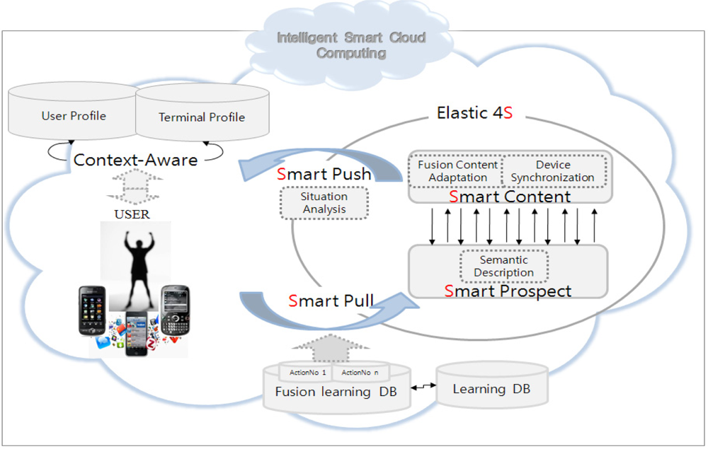 In order to deliver such customized contents to the users at right time, the SCC followed Elastic 4S—Smart-Pull, Smart-Push, Smart-Prospect and Smart-Contents. All the services are based on the collected data through the sensors in user’s device. We have utilized the E4S model and analyzed the sensed information within the category of context. The context-aware model handles the fusion media adaptation, synchronization, and transmission for a smart learning service. We have considered various requirements that for the users, the networks, and the cloud. As a future work, the protocols for smart cloud computing and domain specific ontology will be investigated.