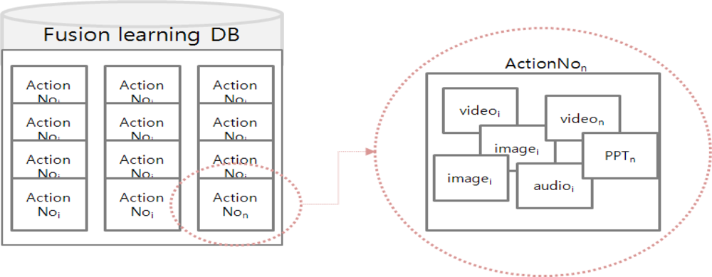The Smart Pull identifies a right action service in fusion learning DB based on the user action in context model. The fusion learning DB consists of various multimedia learning materials such as video, text, PPT and image scattered in different learning DB. For example, if a user action in the context model requests the topic of “multimedia”, the Smart Pull extracts a related action of “multimedia” in fusion learning DB. The fusion contents have some information for teaching with one action scenario (ActionNo) as shown in the Figure 3.