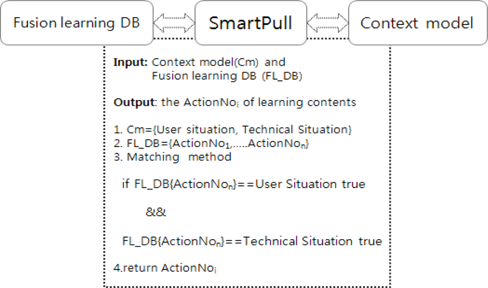 The Smart Pull is the process of extracting learning content in the fusion learning DB through a variety of sensors from the user’s device including user situation and technical situation information based on the context model. The context model is used to filter information from the sensing information. The filtered information is analyzed to determine user’s behavior patterns.