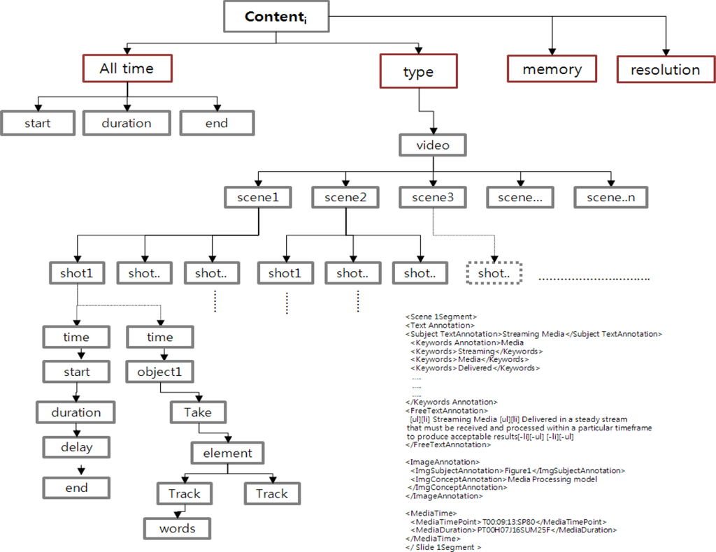 Figure 5 shows a result of a detailed description of video content in ActionNo based on the UVA semantic description model. The Semantic description provides the detail information about video content for the Smart Prospect. The detailed description consists of time, memory, resolution and supported application types for each content. The time information has two types—<All time> and <time offset>. The <All time> represents playback time of the entire video content. The <time> represents the playback time of a shot in the video content. Based on the two types of time information, the next step—Smart Content—performs a synchronization process that utilizes three elements—<type>, <memory>, and <resolution>. The <type> indicates supporting types for some application, such as video, image, PPT or text. The <memory> and <resolution> specifies memory and resolution information of video content, respectively. The process of synchronization between device and content is accomplished by using the <type, memory, resolution> information.