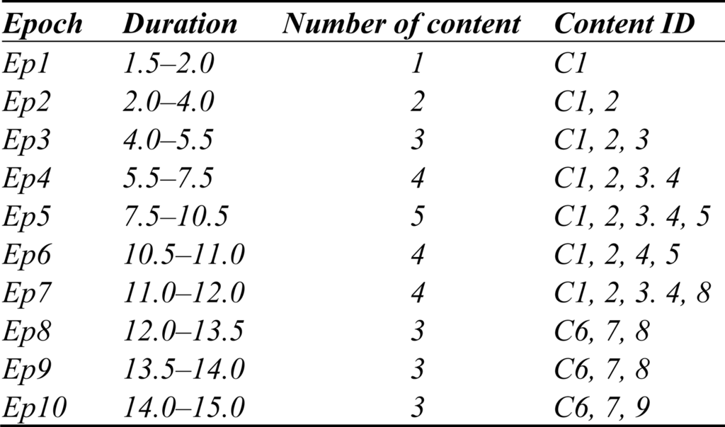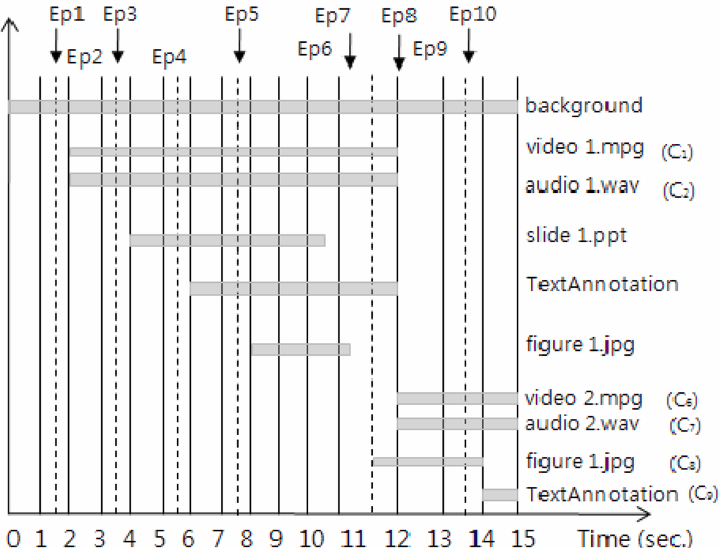 The Smart Content generates the fusion content for the user’s device using the harmony adaptation. The harmony adaptation has two steps—Fusion Content Adaptation and Device Synchronization process. The Fusion Content Adaptation presents the synchronization among the fusion contents in ActionNo. The Device Synchronization performs the process of synchronization between devices. For the synchronization of the fusion contents, the Fusion Content Adaptation (FCA) uses the contents that are indicated by Semantic description from Smart Prospect. The adapted contents include <All time {start, duration, delay, end}> and <time {start, duration, delay, end}> information. For the time synchronization, the FCA uses Interpreter Playout Schedule (IPS) to schedule the order of playout. The IPS uses the duration time of the adapted contents with consideration of the synchronization among connected devices. The simulation results for sample IPS are illustrated in Figure 6.