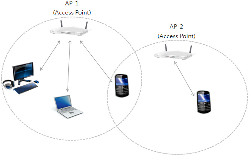 Table 2 shows the information of the access point (AP) based on the user’s location. According to the user’s location, the AP handles multiple devices that are within the range of the AP. An access point connected directly to a wired LAN provides a connection point for wireless users. If more than one access point is connected to the LAN, users can roam from one area of a facility to another without losing their connection to the network. As users move out of range of one AP, they automatically connect to the network (associate) through another AP. The roaming process is seamless and transparent to the user. The Figure 7 shows an access point in an all-wireless network.