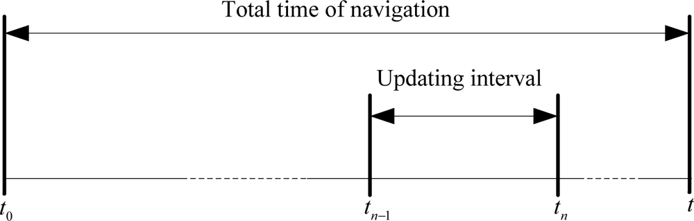 In order to reduce the computational complexity and decouple the relationship between the updating rates of the coning and sculling compensations and the number of the gyro incremental angle and the accelerometer incremental velocity samples, the strapdown algorithm proposed in this section is constructed on the basis of a single-speed structure, i.e., the PVA are updated in all the intervals [tn–1,tn], n = 1, 2, …, with the equal length Tn = tn – tn–1 in the whole navigation time [t0 ,t], as is shown in Figure 1.