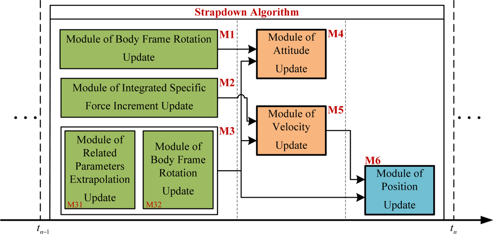 Although the sampling rate of inertial sensors can be up to 2 kHz or even higher, taking into account the complexity of the employed strapdown algorithm and the ability of the current processors, the updating rate of the strapdown algorithm in a serial mode is limited, usually only 200–500 Hz when implemented in a DSP. An effective way to break through the limitation of commonly used navigation computers is to implement the strapdown algorithm on a purely parallel computing platform such as FPGA, and execute the calculations in the algorithm “as concurrently as possible” to make full use of the capability of the parallel computing platform.