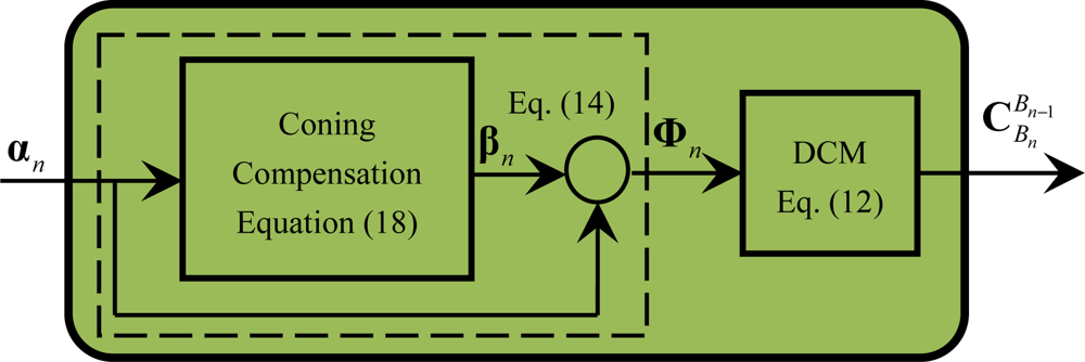 According to Equations (15a), (15b) and (16), the coning compensation term βn has the following form: