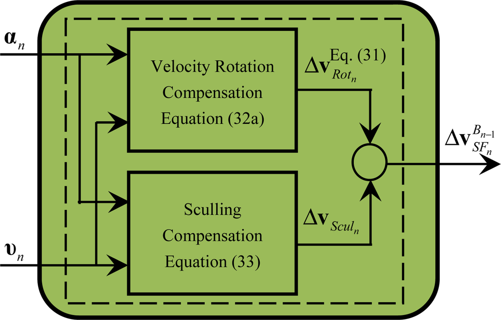 In principle, the approaches used for the coning compensation can also be applied to the sculling compensation. Similar to the optimal generalized coning compensation algorithm in Equation (18), a generalized sculling compensation algorithm that has the simplest form, the optimal accuracy and the minimum computational throughput takes the following form: