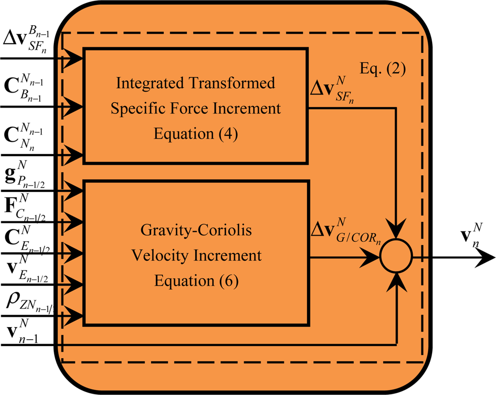In a strapdown inertial navigation system (SINS), inertial sensors are rigidly attached to the vehicle, which leads to the system suffering from the highly dynamic vehicle movement environment. In addition, inertial sensors may be subject to high frequency motion as a result of body bending and engine-induced vibration. The strapdown algorithms adopted by most modern SINSs are constructed based on a general two-speed structure by which the position, velocity and attitude (PVA) updating operations are divided into two parts [1,2]: an exact moderate-speed updating routine (e.g., 50 ∼ 200 Hz) typically designed to update each PVA based on the maximum angular rate and acceleration of vehicle; and a high-speed updating routine (e.g., 1 ∼ 4 KHz for an aircraft INS with the positioning accuracy of less than 1 nmile/h) designed to accurately account for vibration-induced coning and sculling effects based on the anticipated vibration condition of the system. The original intention of the two-speed structure is to overcome the throughput limitations of early computer techniques, but the limitation is rapidly becoming insignificant with the continuous improvement in the performance of modern high-speed computers [3]. On the other hand, along with the fast progress of modern vehicles in ultra-high speed and other maneuvering performances, there exist more and more urgent demands to promote the navigation and control precision of the vehicles in high dynamic motion. It provides the motivation to return to a simpler single-speed structure of the strapdown algorithm in which all computations are executed at a single updating rate that is sufficiently high to accurately account for high frequency angular rate and acceleration rectification effects.