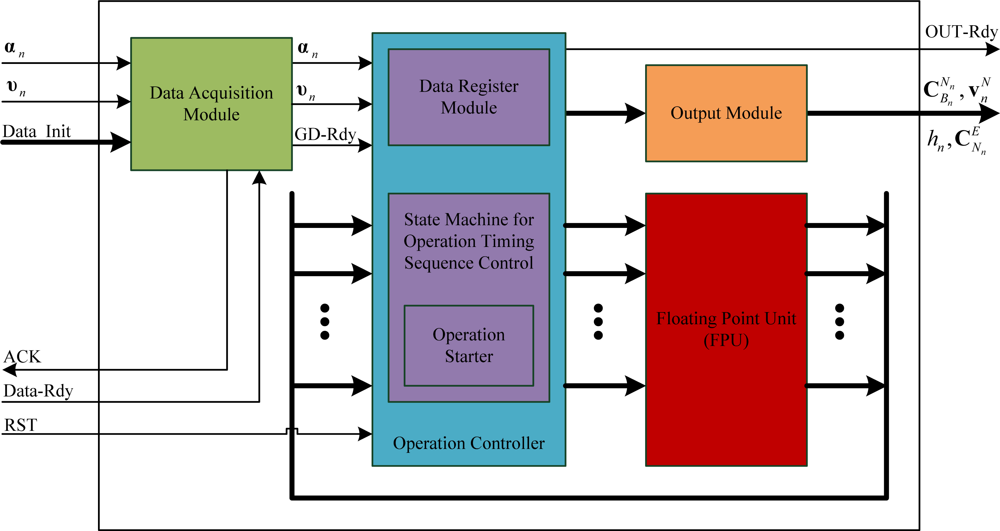 The parallel strapdown algorithm proposed in Section 3 has been implemented on a FPGA platform in the structure shown in Figure 9. The data acquisition module receives the input signal (the gyro incremental angle αn, the accelerometer incremental velocity υn and the initial alignment data Data_Init) and writes the data to the data register module in the operation controller, then notifies the operation controller to start the strapdown calculations through the signal GD_Rdy. The operation controller sends the data stored in the data register module in a parallel mode to the input registers of the floating point unit (FPU), and starts the FPU by the operation starter. The operation results ( , , hn and ) are then exported through the output module. The handshake signals ACK and Data_Rdy are used for the communication between the data acquisition module and the external module such as the initial alignment or noise filtering of inertial sensor output samples that is beyond the scope of this paper; and the operation controller can be reset by the signal RST. The state machine in the operation controller is used to control the execution of operations in an appropriate time sequence.