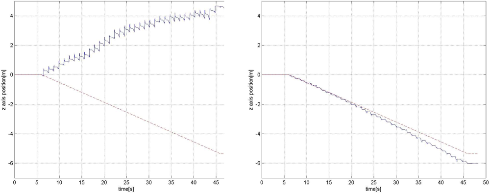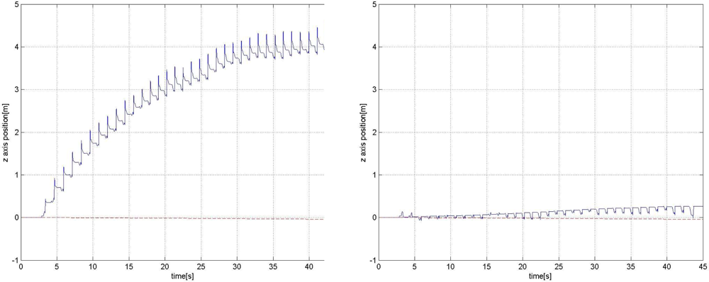 The z axis position estimation (the third element of r) result for road A (indoor corridor) is given in Figure 8. The left graph in Figure 8 shows the z axis position estimation without the height compensation, where the inertial navigation algorithm with zero velocity updating is used. The straight line in the plot is the estimated actual z axis position, which is computed from the inclination angle of the road and the walking distance (50 m). We can see the error increases rapidly. The error growth depends on many elements such as sensor scaling factor calibration, bias stability, sensor axis alignments and sensor saturation. We only performed simple calibrations. An initial gyroscope bias is estimated by averaging initial 1 minute gyroscope data while the sensor unit is not moving. Also, the accelerometer offset is estimated by rotating the accelerometer 360° and finding the center value. With this simple calibration, the error seems to be large. The right graph in Figure 8 shows that the z axis position is corrected using the proposed height compensation algorithm.
