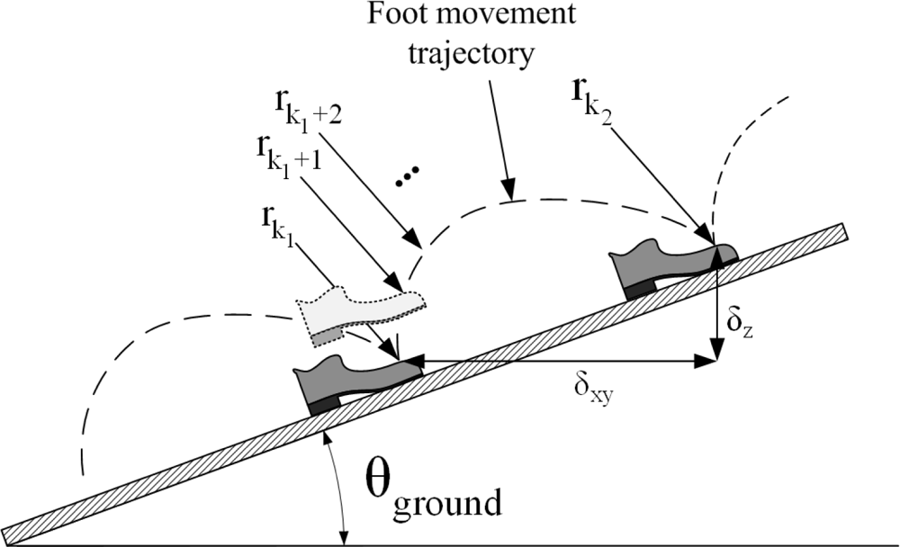 A typical foot movement trajectory when a person is walking on a slope is given in Figure 3. Note that rk1 is the foot position at the discrete time k1. In this example, the foot is on the slope at the discrete time k1 and k2. A person walked one step between the time k1 and k2. Thus rk1 is the position before one step walking and rk2 is the position after the step. Let δz,k1,k2 and δxy,k1,k2 be the horizontal and vertical distances between rk1 and rk2, respectively:
