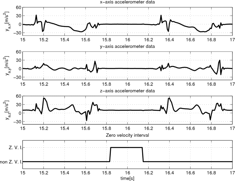 In Figure 4, typical accelerometer data (ya) are given. The accelerometer output from XSens MTi28A53G25 is a low pass filtered signal with the bandwidth 30 Hz (see Table 1). The full scale range of the accelerometer is 50 m/s2 and note that there is saturation in ya,z, which may cause large z axis velocity and position errors. The detected zero velocity interval is also given.
