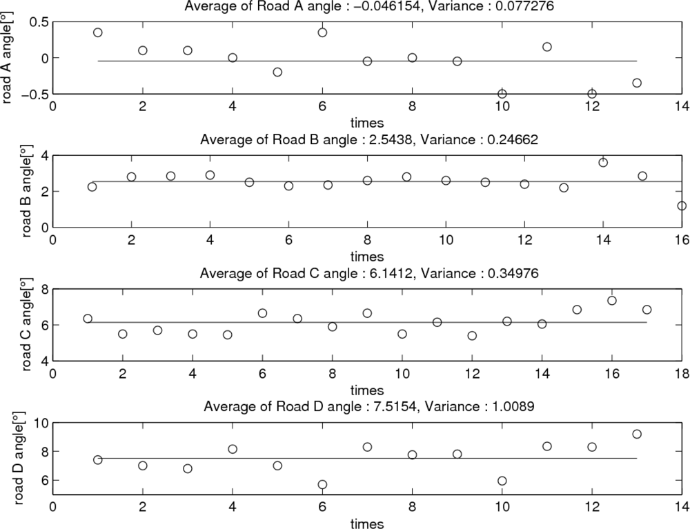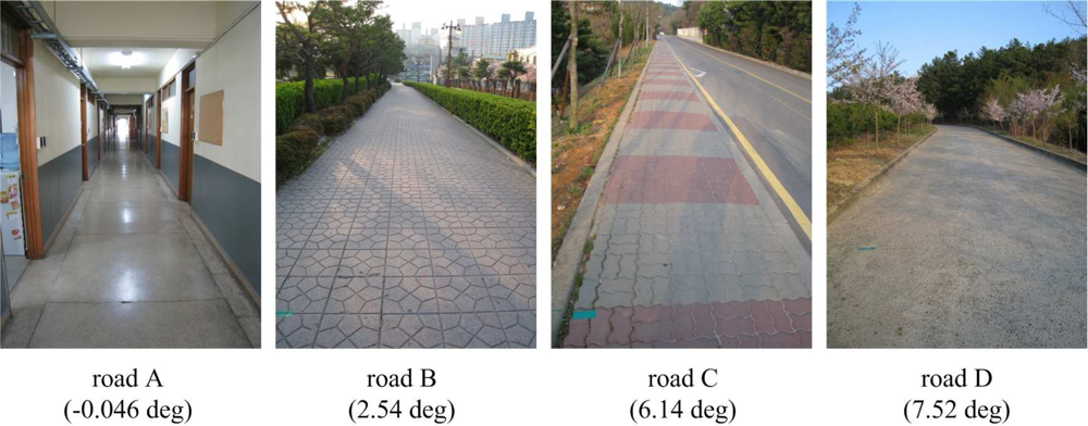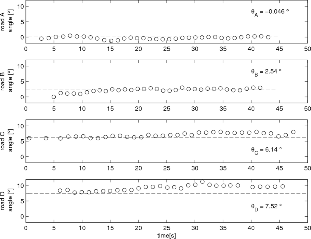 To test the proposed algorithm, four roads are selected (see Figure 5). These roads are more than 50 m long and the inclination angles are almost constant. The inclination angle of each road is measured with a digital inclinometer: inclination angles are measured at several points (13–17 points for each road) and the average value is considered as the inclination angle of a road. The results are given in Figure 6.