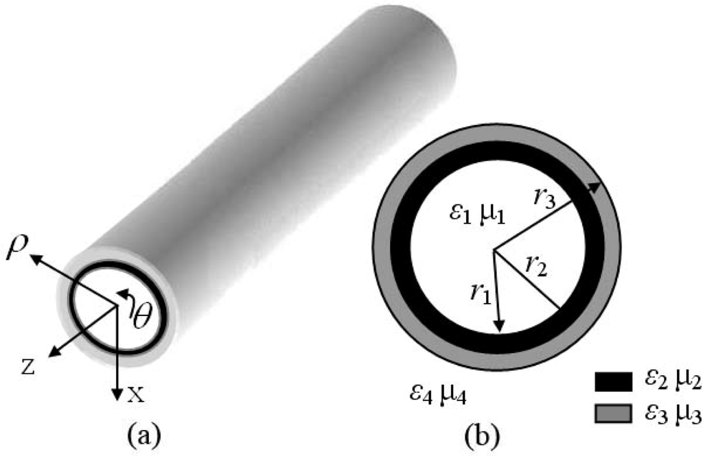 Figure 1 shows the geometry of a cylindrical dielectric waveguide loaded with a layer of metamaterials. The inner side of the e cylindrical dielectric waveguide (ε3,μ3) is loaded on a metamaterial layer (ε2,μ2). The waveguide has a four-layer structure. The material parameters of regions 1, 2, 3, 4 are denoted as (ε1,μ1), (ε2,μ2), (ε3,μ3), (ε4,μ4), respectively. The axial fields in corresponding regions for TM mode [30] are: