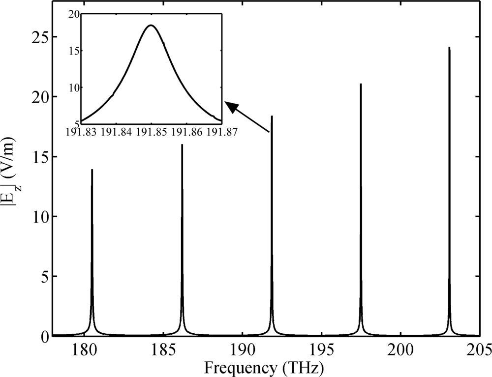 The frequency spectrum of the NPM sensor for homogeneous sensing is simulated by the finite element software COMSOL Multiphysics (COMSOL Inc., Burlington, MA, USA), as shown in Figure 3. In the simulation, the computational space is surrounded by a scattering boundary. The excitation is set at port A of the waveguide. The spectrum is obtained by frequency sweep. From left to right, the spectral lines represent modes 25, 26, 27, 28 and 29 of the NPM sensor. The inset shows the amplification in the 191.83–191.87 THz frequency range. Table 1 shows the comparison of the analytical and simulated resonant frequency for the microring sensor and the NPM sensor. Therefore, WGMs (m = 25, 26, 27, 28, 29) in the cross section of the waveguide correspond to the modes of the microring sensor and the NPM sensor. The analytical resonant frequency of the sensor can be obtained by setting | M | = 0 (details may be found in next Section). The maximum deviation between simulation results and analytical results is 0.011 THz. The analytical results are in good agreement with the simulation results.