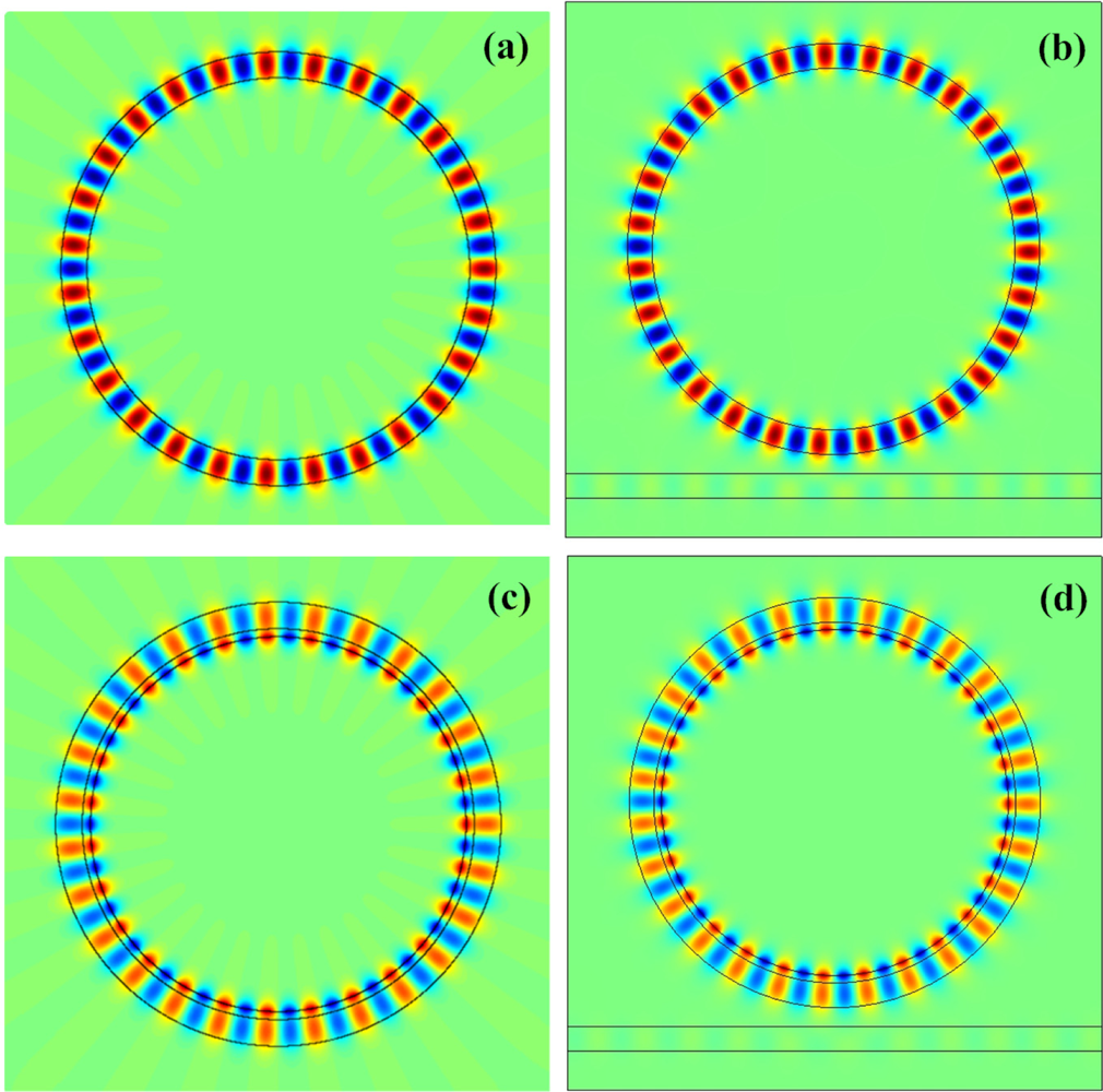 Supposed that material parameters of the waveguide in region 1, 2, 3, 4 are ε1 = εrε0, μ1 = μ0, ε2 = ε0, μ2 = –μ0, ε3 = 10.24ε0, μ3 = μ0, ε4 = ε0, μ4 = μ0, respectively. The resonant frequency of WGM (m = 27) in the cross section of the waveguide can be calculated by setting | M |=0. The coefficients , , , , can be easily obtained according to Equations (6)–(10). The electric field distribution of the WGM can be calculated according to Equation (2), and are shown in Figure 4(a,c). To confirm the WGM in the cross section of the waveguide corresponds to the mode of the microring resonator, we simulate the electric field distribution of the microring resonator, as shown in Figure 4(b,d). From Figure 4, we can observe that the theoretical results are in good agreement with the simulation results. Interestingly, we find that the maximum electric field is located at the interface of the NPM layer and core medium. This implies that a microring resonator loaded on an NPM layer has higher sensitivity than a traditional microring resonator without loading on the NPM layer.