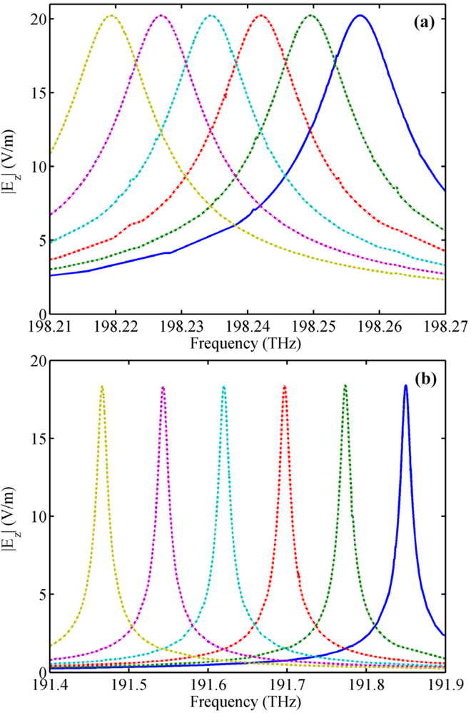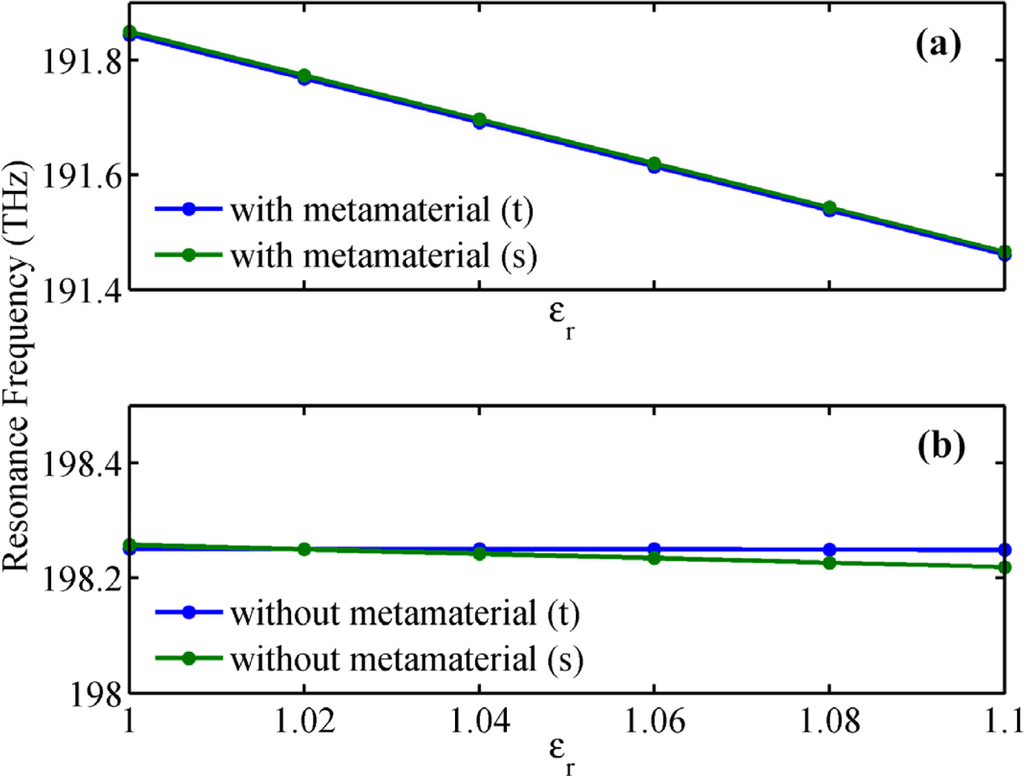 To confirm the above idea, we simulated the performance of the microring sensor and the NPM sensor for homogeneous sensing, as shown in Figure 5. Permittivity (εr) of the dielectric core varies from 1 to 1.1 with an interval of 0.02. From Figure 5(a,b), we can observe that the spectra red shift with the increase of εr. Sensitivity for the microring sensor and the NPM sensor is 5.9 nm/RIU and 64.2 nm/RIU, respectively. Here, sensitivity is defined as . Figure 6(a,b) show the analytical and simulating resonant frequency for the NPM sensor and microring sensor, respectively. Simulating frequencies are calculated from Figure 5, while the theoretical frequencies are obtained by setting | M |=0. From Figure 6, we find that the simulation results are in good agreement with the theoretical results. With an increase of 0.02 in core medium permittivity, average frequency shift for the NPM sensor is very large [Figure 6(a)], but the average frequency shift of the microring sensor is quite small [Figure 6(b)]. Therefore, the NPM sensor possesses much higher sensitivity than the traditional microring sensor.